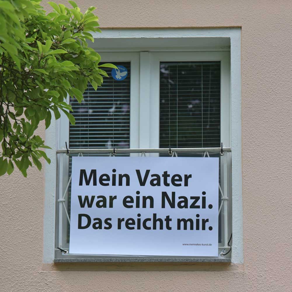 Mein Vater war ein Nazi. Das reicht mir. Kunstpunkte-Beitrag 2025. Auch zu den Kunstpunkten 2025 wird die öffentliche Präsentation von zeitaktuellen Plakatmotiven, sowie das Publikums-Gespräch, wieder ausschließlich draußen stattfinden. Bei „Wetter“ also bitte einen Regenschirm mitbringen. Plakat/Foto: © Ulrich Mennekes 2025