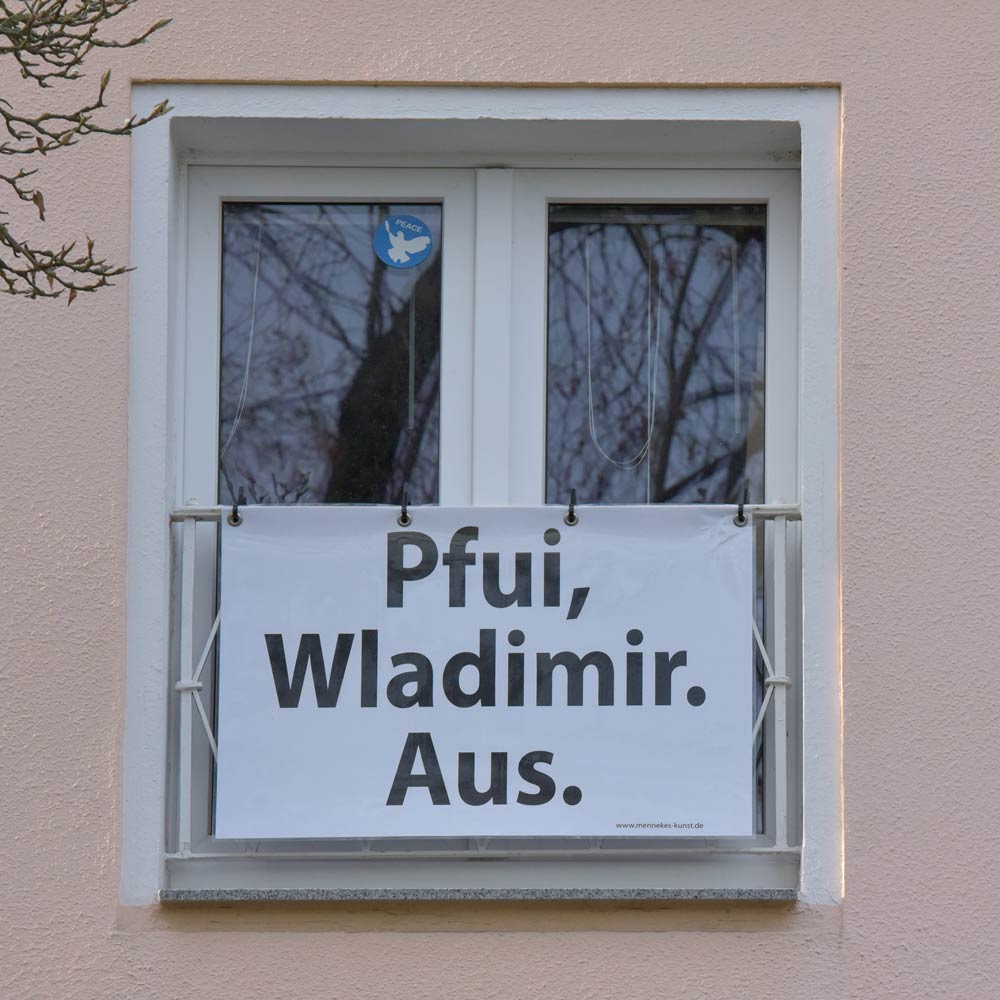 Seit nunmehr drei Jahren (seit dem 24.02.2022) führt dieser Wladimir seinen, von ihm absichtsvoll, und voller gebiets-expansiver Vorsätze begonnenen, blutigen und Menschenleben verachtenden Angriffs-Krieg gegen die Ukraine. Ein Krieg mit dem der blutige Wladimir besonders die ukrainische Zivilbevölkerung – gezielt – vernichtend angreift. Seitdem gibt es also auch wieder einen heißen Krieg in Europa. Das Plakatmotiv „Pfui, Wladimir. Aus.“ ist immer wieder in der Fenstergalerie zu sehen gewesen – und hängt aktuell auch wieder an der Fassade.